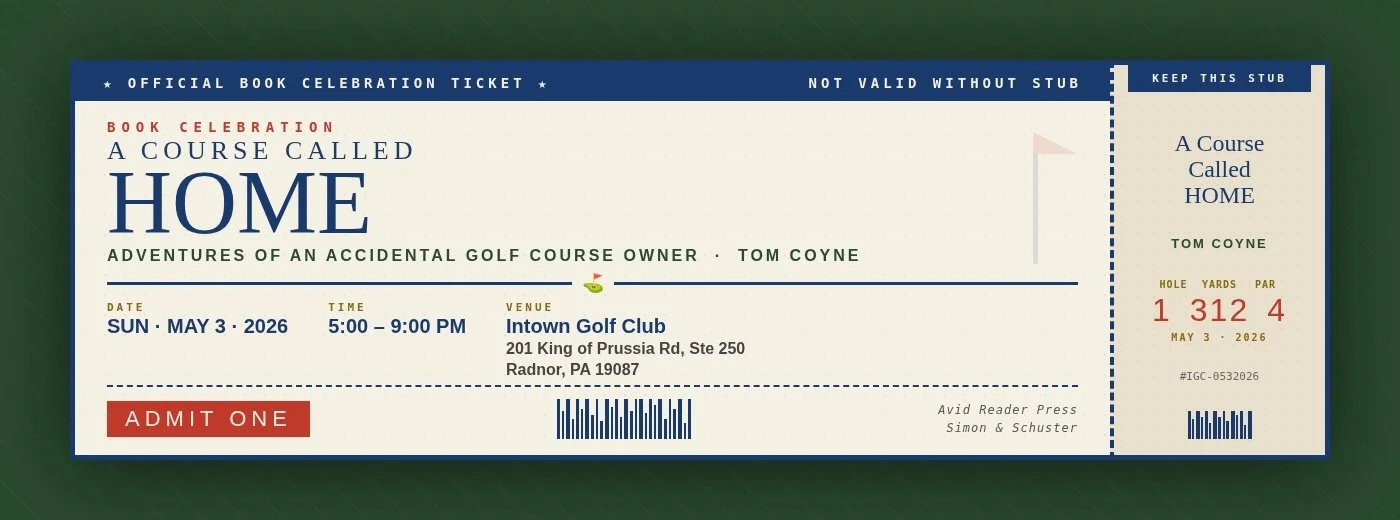 Join us to celebrate the release of Tom’s latest book, A Course Called Home at Intown Golf Club, a private indoor golf and social club on Philladelphia’s Main Line.